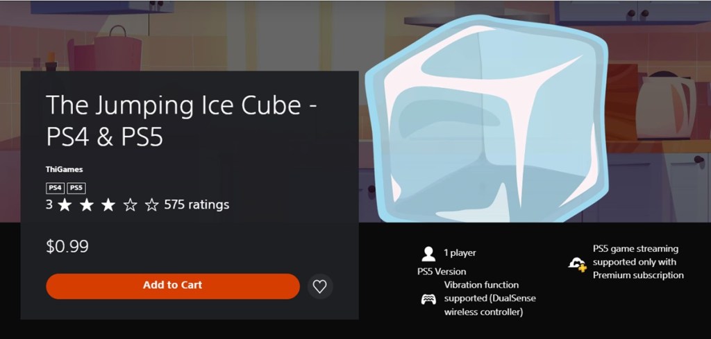 The Jumping Ice Cube’s PS5 page proudly displays the message “PS5 game streaming supported only with Premium subscription.” I thought this was a mistake, so I checked the game’s store pages via the web browser for the U.S. and U.K. regions, and found that they both supported the PS5 streaming label.